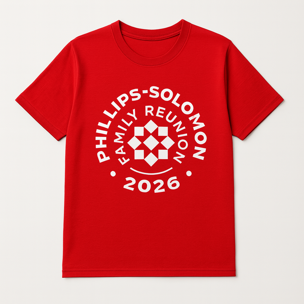 This year’s official reunion t-shirt will be red with a white logo, proudly featuring the Phillips Solomon Family Reunion design. To secure your shirt, registration is required. $30 per person, $15 for Children. This Includes your t-shirt, reunion bag, and registration fee. Orders will be collected during the registration process. These shirts are a symbol of our family’s unity and will serve as both a keepsake and a way to easily identify fellow family members during our celebration.